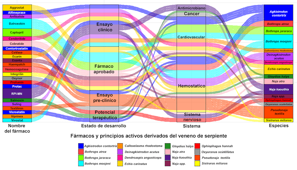 Figura 2. Diagrama aluvial que representa la relación entre los fármacos o compuestos activos, el veneno de serpiente, los sistemas humanos y el estado de desarrollo del farmacológico.