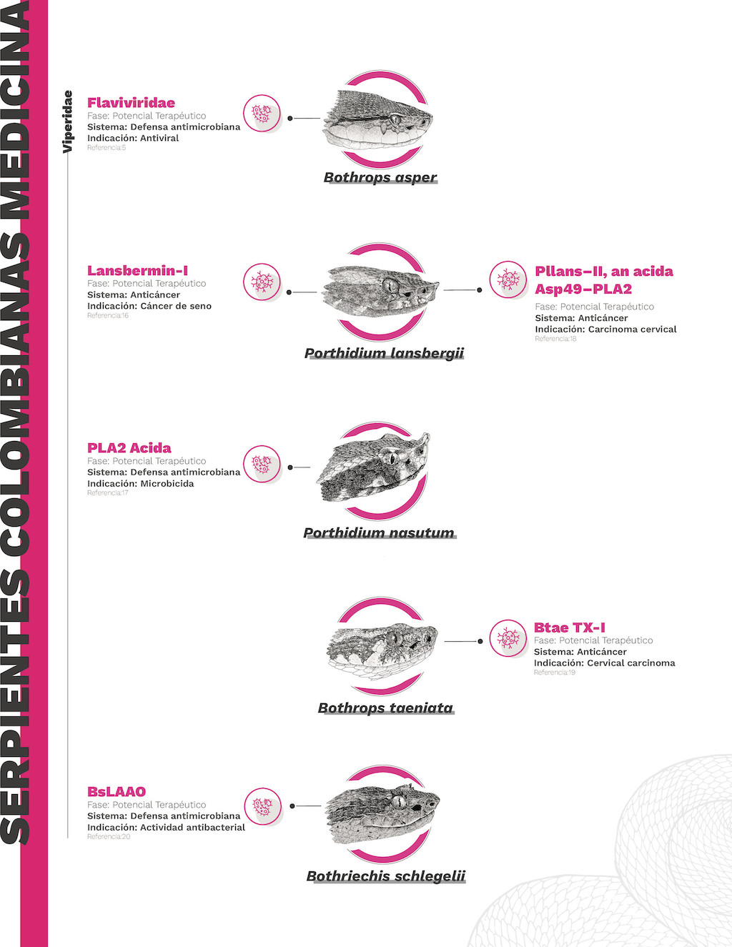 Adicionalmente, la especificidad, afinidad y selectividad de sus toxinas, ofrecen una excelente oportunidad para nuevas intervenciones farmacológicas, con mecanismos de acción más efectivos, menores interacciones negativas y efectos adversos. Estas características son esenciales en la elaboración del «fármaco ideal», el cual podría producirse a partir del veneno de serpiente [34]. Actualmente, existen numerosos nuevos fármacos para uso humano derivado de sus toxinas con efectos antihipertensivos, antitrombóticos, anticoagulantes, antivirales, analgésicos, neuromoduladores y fibrinolíticos (Tabla 1). Aunque estas toxinas son útiles como fármacos, también pueden ser útiles en el diagnóstico y estudios de mecanismos celulares [35].