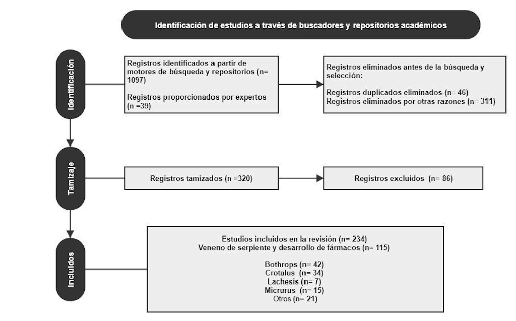 Las estrategias de búsqueda contenían las siguientes palabras clave y términos que se combinaron de diferentes formas utilizando los conectores booleanos AND OR: snake venoms, Bothrops atrox, Crotalus, Bothiechis, Porthidium, Lachesis, Micrurus, Xenodon, Leptophis, Erythrolamprus, Oxybelis, Helicops, Bothrocophias, Thamnodynastes, Leptodeira, Philodryas, and drug development.