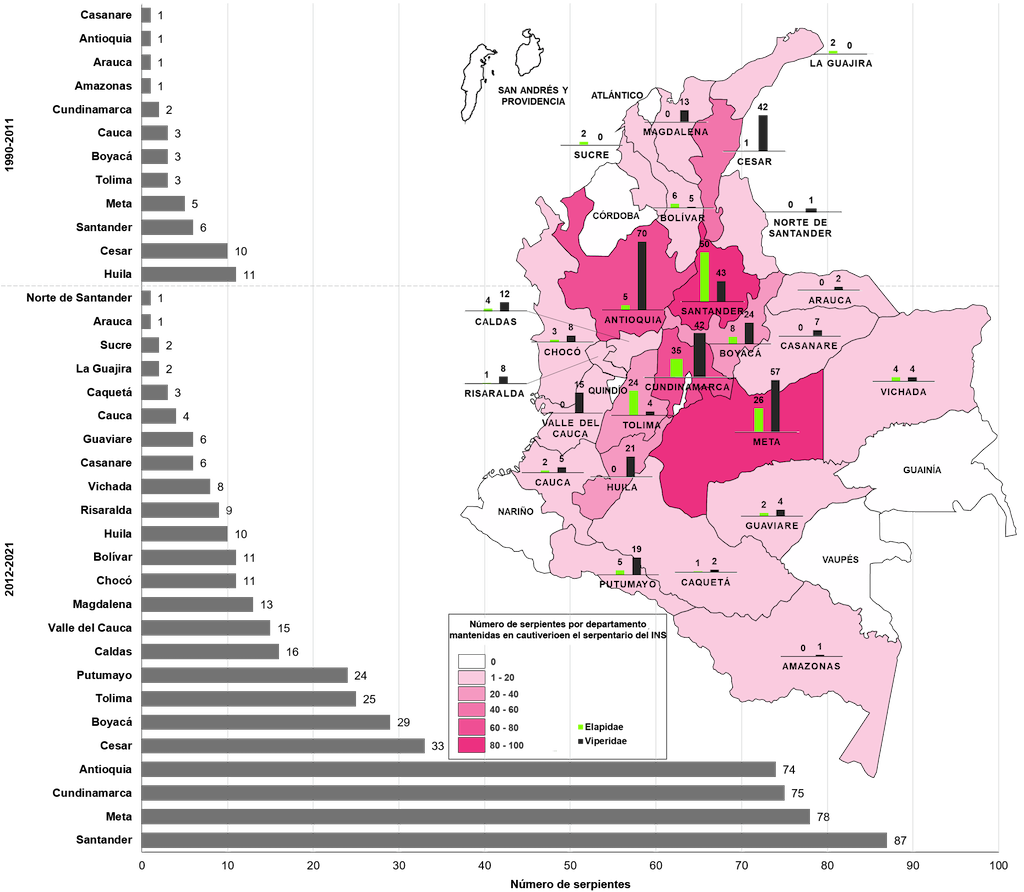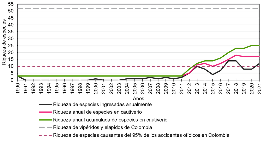 La clave para establecer un programa a gran escala para la producción de antiofídicos es mantener vivas la mayor cantidad de serpientes de importancia médica en un ambiente intensivo de cautiverio. Sin embargo, el cautiverio está asociado con factores estresantes que pueden provocar cambios fisiológicos y comportamentales crónicos y constantes en las serpientes, conllevando a niveles no adaptativos de glucocorticoides que causan el detrimento del bienestar de las serpientes. Comprender las patologías y sus impactos en las serpientes en cautiverio, así como aprender las mejores prácticas para su manejo, son los principales objetivos que busca un serpentario para la producción de antiofídicos. Sin embargo, llegar a comprender y aprender de las lecciones es un largo camino en el que los enfoques empíricos, el sentido común y la experiencia de los mayores son la mejor guía. Este capítulo resume y analiza los datos históricos disponibles desde 1990 a 2021 de las serpientes cautivas empleadas para la producción de antiofídicos alojados en el serpentario del Instituto Nacional de Salud de Colombia. Además, brindamos una breve historia de las lecciones aprendidas sobre las serpientes venenosas alojadas en el serpentario, así como la información más interesante sobre ellas.​